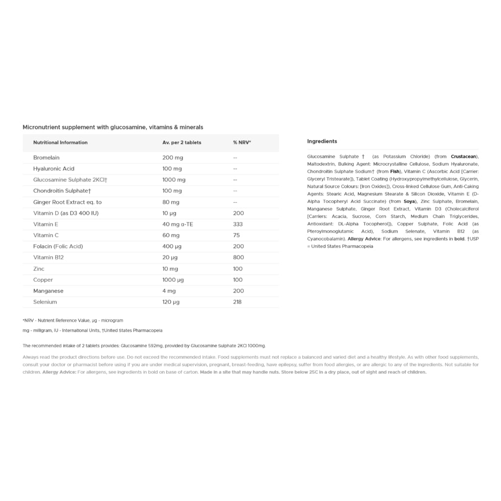 • Contains glucosamine, chondroitin & hyaluronic acid for joint structure & lubrication