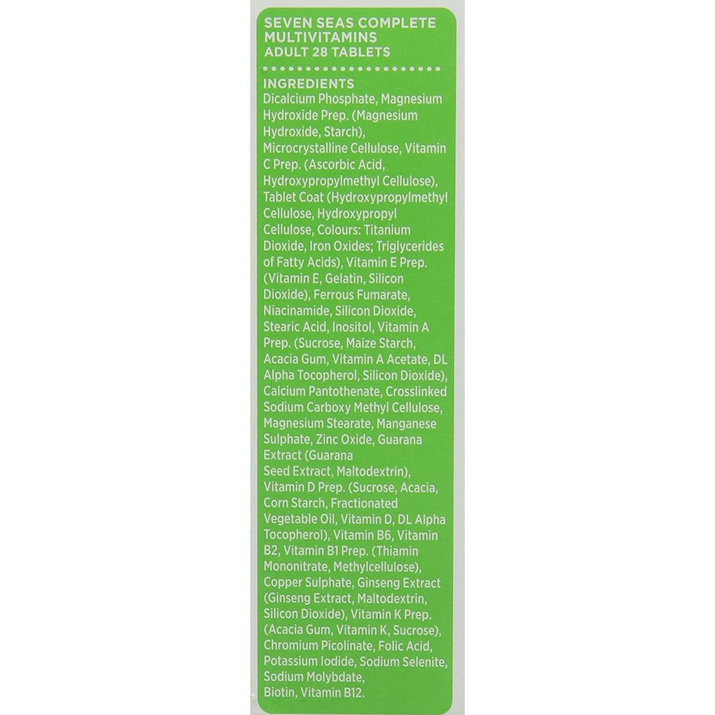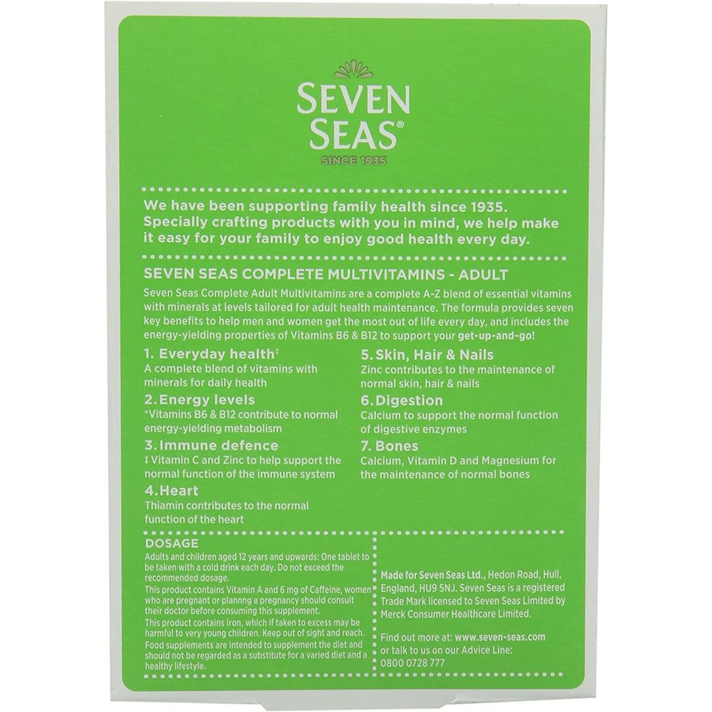 Seven Seas Complete Adult Multivitamins are a complete A-Z blend of essential vitamins with minerals at levels tailored for adult health maintenance. The formula provides seven key benefits to help men and women get the most out of life every day.