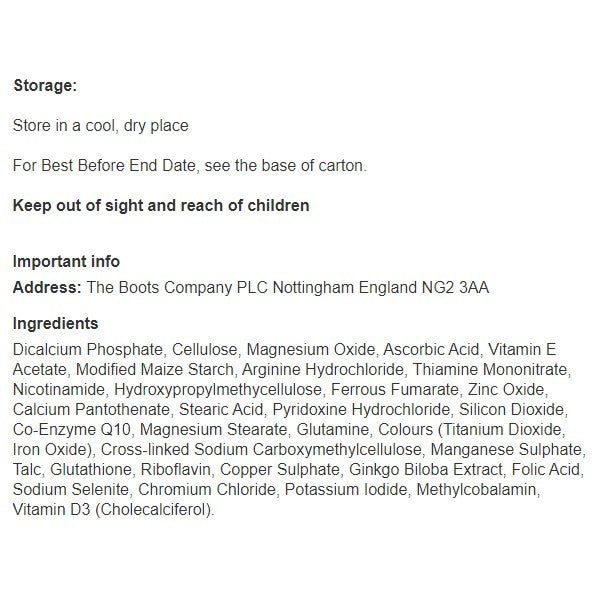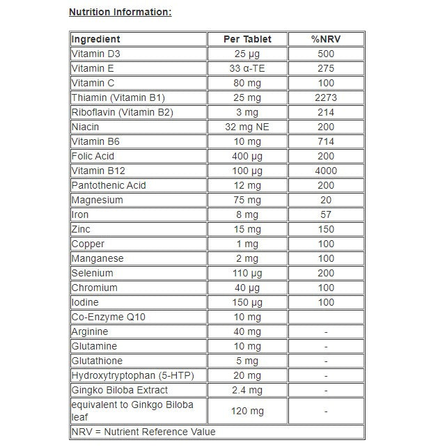 This formula contains optimal levels of Pantothenic Acid (B5) to support mental performance and concentration, Zinc and Iodine to maintain cognitive function, and Vitamins B6 and B12 to release energy and reduce tiredness and fatigue. The added Gingko Biloba has been a fundamental ingredient in the Chinese medicine and studies have proven its abilities to improve memory in healthy people or those who suffer of neurological disease.
