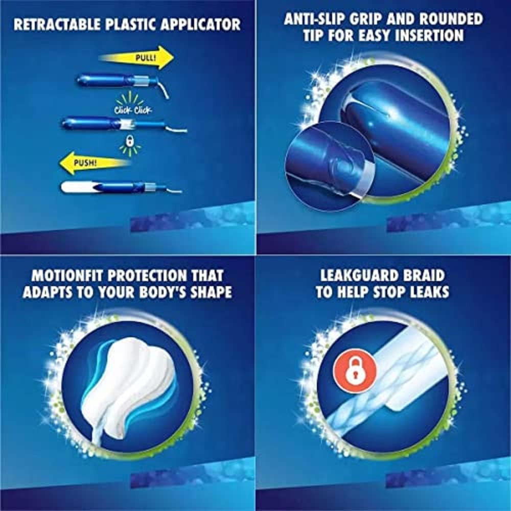 Tampax Pearl Compak tampons offer comfort and reliable protection with a compact, smooth applicator for easy insertion and a secure Anti-Slip Grip. The MotionFit technology adapts to your body's shape, while the LeakGuard braid helps prevent leaks.
