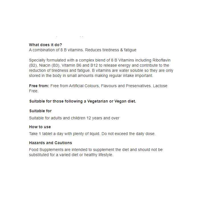 Specially formulated with a complex blend of 8 B Vitamins including Riboflavin (B2), Niacin (B3), Vitamin B6 and B12 to release energy and contribute to the reduction of tiredness and fatigue. This product is designed to be slowly released into the body throughout the day to support your overall energy levels.