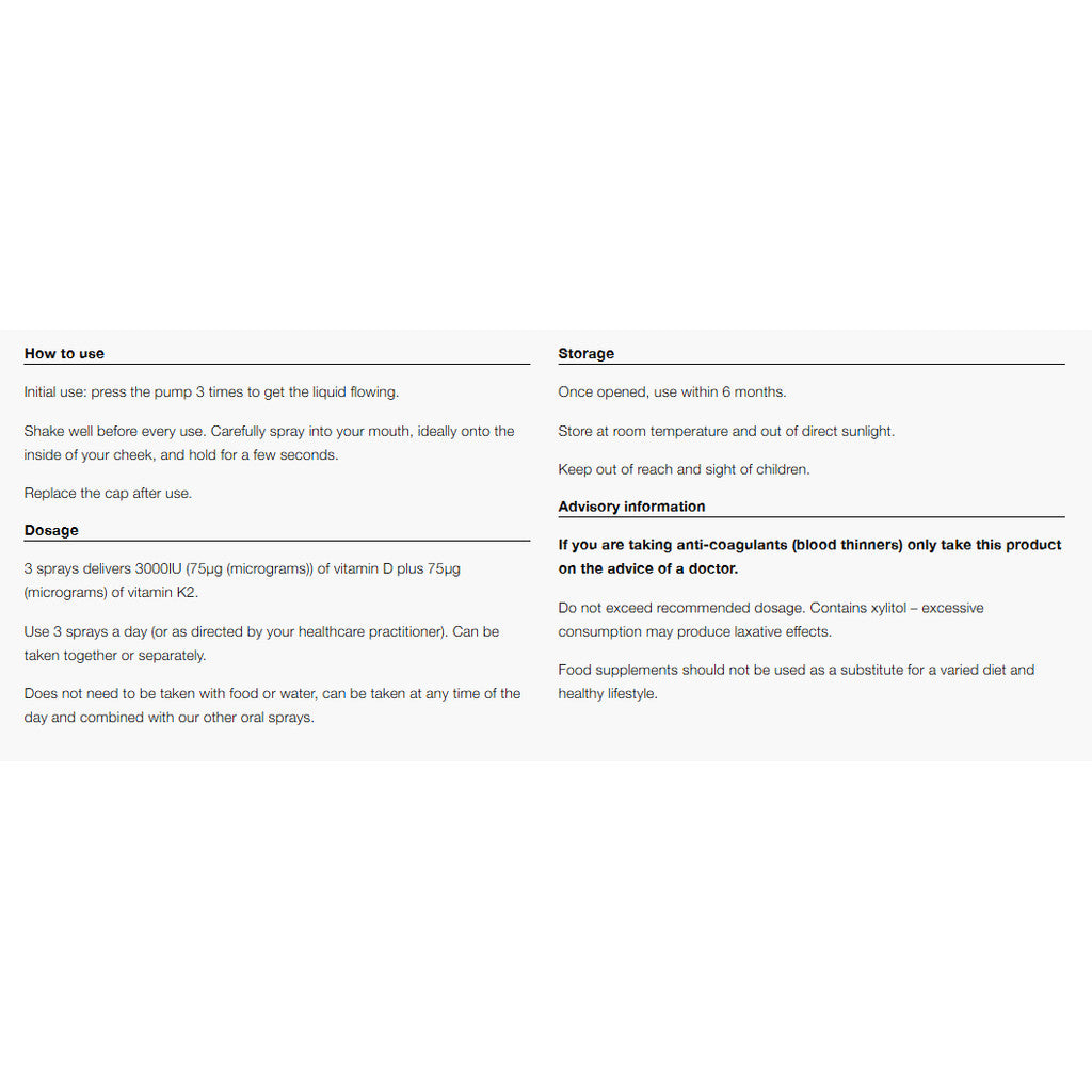 • Strength per spray: 1000 IU of Vitamin D3 + 25μg of Vitamin K2