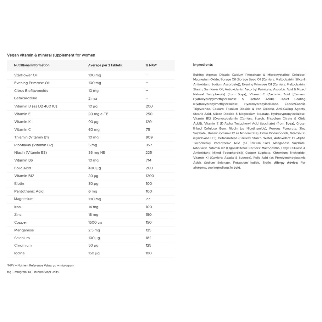 The formula contains a wide range of nutrients and trace elements to support the areas of health which are of most interest to women including Vitamin B6 which contributes to the regulation of hormonal activity, plus iron which contributes to normal formation of red blood cells and haemoglobin, an important consideration during the monthly cycle.
